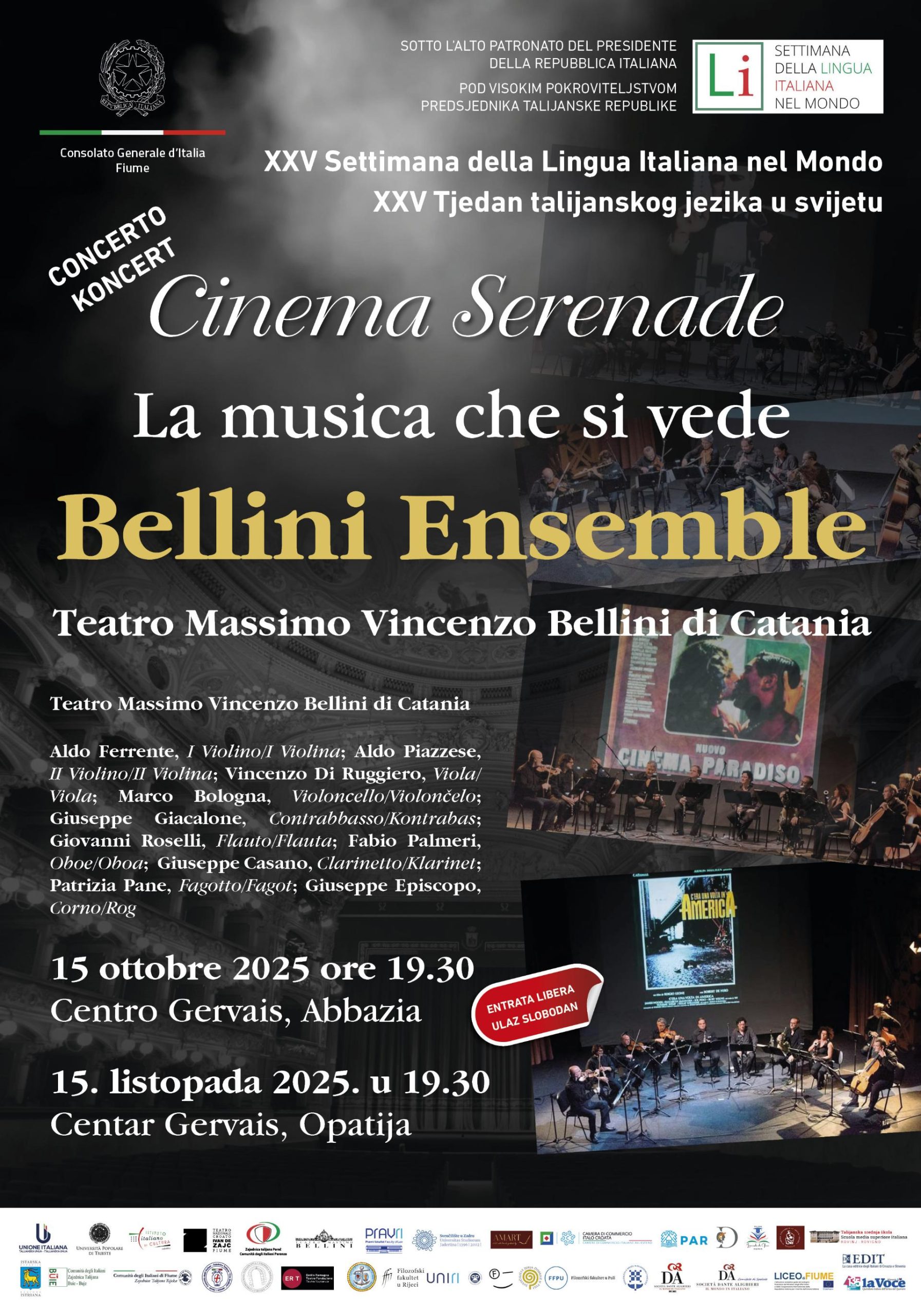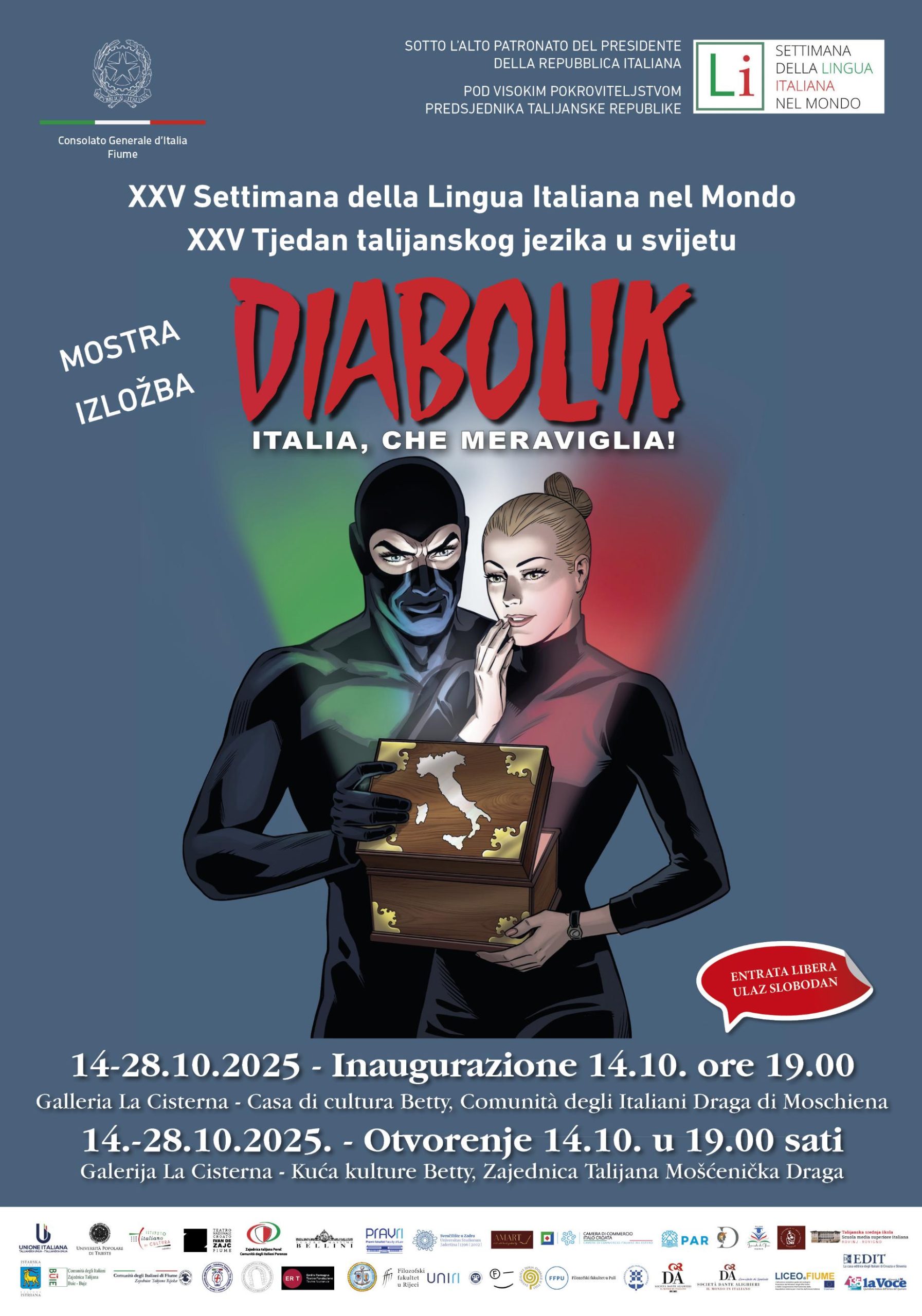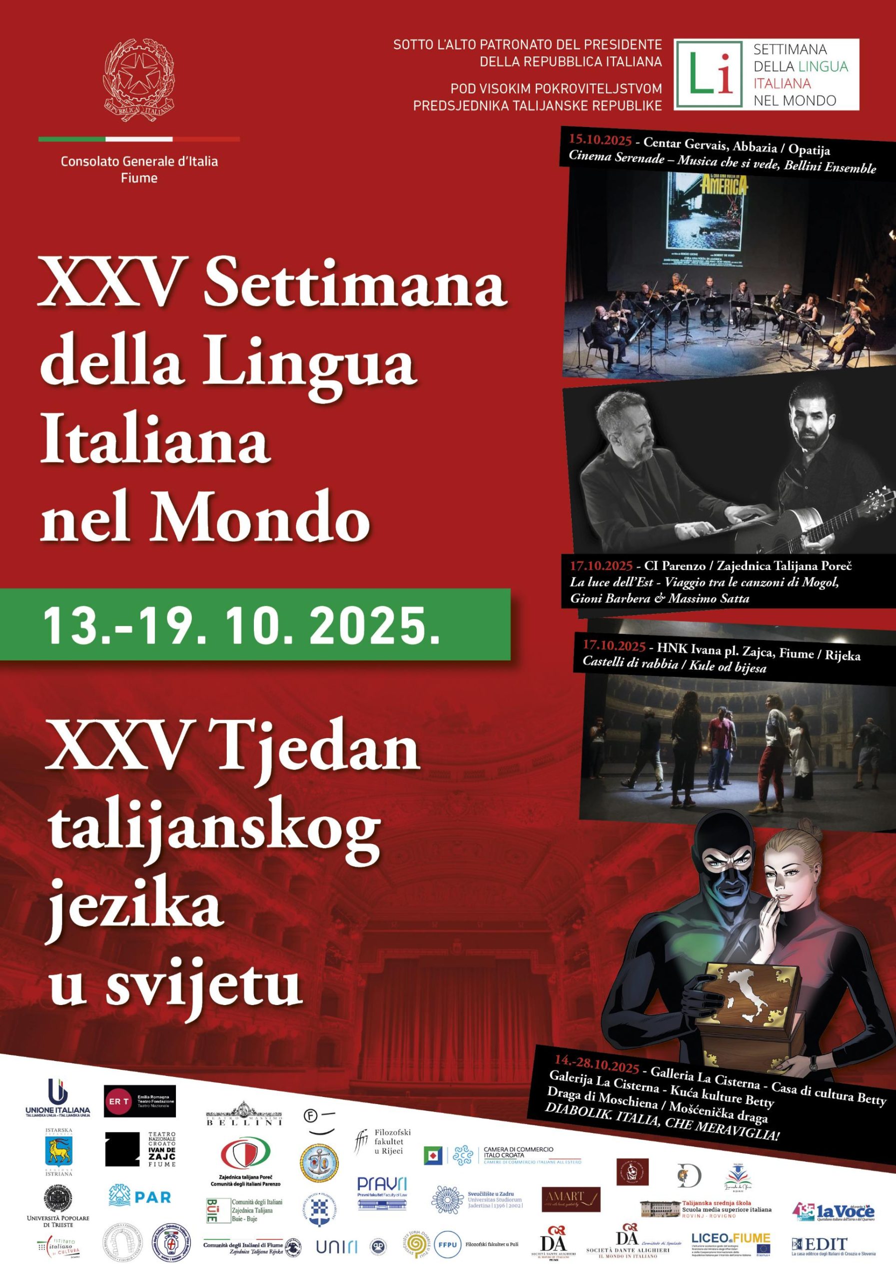 La ricca programmazione della XXV SLIM in Croazia vedrà il coinvolgimento di numerosi promotori e partner nell’organizzazione, tra cui l’Ambasciata d’Italia a Zagabria; il Consolato Generale d’Italia a Fiume; l’Istituto Italiano di Cultura di Zagabria; l’Unione Italiana e le Comunità degli Italiani di Buie, Draga di Moschiena, Fiume, Parenzo, Pola e Rovigno; l’Ambasciata di Svizzera in Croazia; la Regione Istriana; il COMITES di Fiume, i Dipartimenti di italianistica delle Università di Fiume, Pola, Spalato, Zara e Zagabria; la Facoltà di Giurisprudenza dell’Università di Fiume; l’Università Popolare di Trieste, la Società Dante Alighieri di Spalato; l’Associazione Croata dei Professori d’Italiano – ACAPI/HUPTI, il Dramma Italiano di Fiume, l’EDIT, ERT – Emilia Romagna Teatro Fondazione e diverse istituzioni scolastiche.